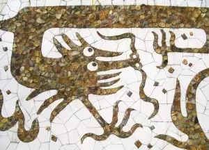 這幅龍形壁畫由近萬塊碎陶片組成,且這些陶片來歷非凡。其中有發(fā)掘于南風(fēng)古灶附近的明清時(shí)代陶片,約一百到六百年的歷史;有發(fā)掘于張槎奇石唐宋時(shí)代的陶片,約一千年的歷史;更有部分發(fā)掘于河宕貝丘遺址的新石器時(shí)代陶片,距今已有五千年的歷史了。