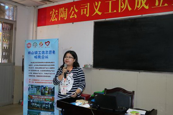 接著由獅山鎮(zhèn)工會志愿者服務(wù)總隊對宏陶義工團隊進行志愿者基礎(chǔ)知識培訓(xùn),同時詳細介紹了獅山鎮(zhèn)工會志愿者服務(wù)總隊的組織架構(gòu)、特色服務(wù)活動、總隊志愿者的權(quán)力和義務(wù),闡述了志愿者利用業(yè)余時間投身社會服務(wù)過程中不但能承擔(dān)到社會責(zé)任,又能愉悅身心、展現(xiàn)出個人的自身價值,同時也了解到志愿者服務(wù)可以幫助家庭中積分入學(xué)、積分入戶的民生系列問題。