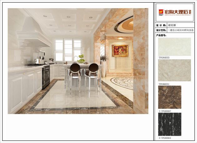 800X400(mm)全拋釉磚陶瓷產(chǎn)品,由于采用國(guó)際先進(jìn)的3D噴墨印刷技術(shù),磚面圖案紋理非常清晰,質(zhì)感細(xì)膩豐富、完全可與大自然的大理石材比美,往往留給人一種源于自然,勝于自然的印象。該規(guī)格不管在經(jīng)典彷古磚門(mén)類中,還是在全拋釉的家族里都是一種全新的史無(wú)前例的規(guī)格,在一定程度上沖擊著全拋釉方正規(guī)格上墻的常用手法,也帶給了人們一種更新更美的思維裝飾方式。從此,人們會(huì)從衛(wèi)浴空間與廚房的墻上看到了全拋釉磚這種小而美的長(zhǎng)方形的鋪貼取向。是否有人認(rèn)為廚衛(wèi)空間與客廳空間的墻上裝飾用磚成了小規(guī)格全拋釉與大規(guī)格瓷片、常規(guī)拋光磚瓜分天下的局面呢?讓我們?cè)嚹恳源?
