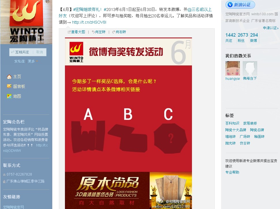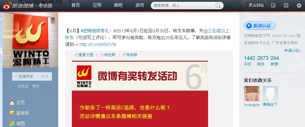 為了進一步推進該活動的廣泛傳播,讓更多的消費者、網(wǎng)民或微博粉絲了解宏陶,關(guān)注宏陶,也讓微博新手或不會微博的朋友快捷、方便地玩轉(zhuǎn)宏陶官方微博有獎轉(zhuǎn)發(fā)?,F(xiàn)把“關(guān)注宏陶,禮品多多“宏陶官方微博有獎轉(zhuǎn)發(fā)方法,詳細介紹如下: