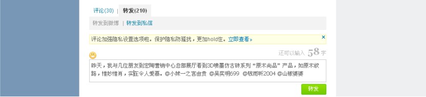 緊接著,在轉(zhuǎn)發(fā)的輸入框中輸入自己贊美宏陶品牌或產(chǎn)品的文字及@好友1@好友2@好友3@好友4,最后點擊