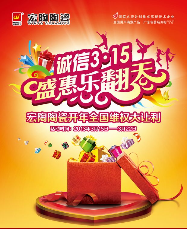 3?15消費(fèi)者權(quán)益日即將到來,為了提高宏陶陶瓷品牌的影響力和增強(qiáng)其銷售團(tuán)隊(duì)的戰(zhàn)斗協(xié)作性,又應(yīng)部分經(jīng)銷商的要求,在“3?15”消費(fèi)者權(quán)益日集中宣傳宏陶品牌的同時(shí)進(jìn)一步促進(jìn)銷售,于此,公司市場(chǎng)部認(rèn)真研究制定了經(jīng)銷商終端3.15活動(dòng)方案模式、設(shè)計(jì)了相關(guān)的活動(dòng)宣傳模板,供區(qū)域經(jīng)銷商參考。請(qǐng)經(jīng)銷商根據(jù)區(qū)域市場(chǎng)的需要,登陸宏陶陶瓷官方網(wǎng)站“經(jīng)銷商專區(qū)”的<促銷方案>欄目下載,做好3?15活動(dòng)促銷的前期宣傳工作,敬請(qǐng)留意!